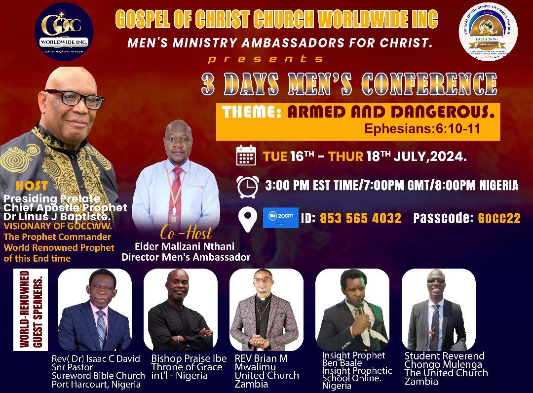 THREE DAYS MEN’S CONFERENCE GOSPEL OF CHRIST CHURCH WORLDWIDE(GOCCW)- THE PREMIER KINGDOM BUILDERS MOVEMENT TO REVOLUTIONIZE THE WHOLE BODY OF CHRIST AND A SPIRITUAL HOSPITAL FOR Read More »